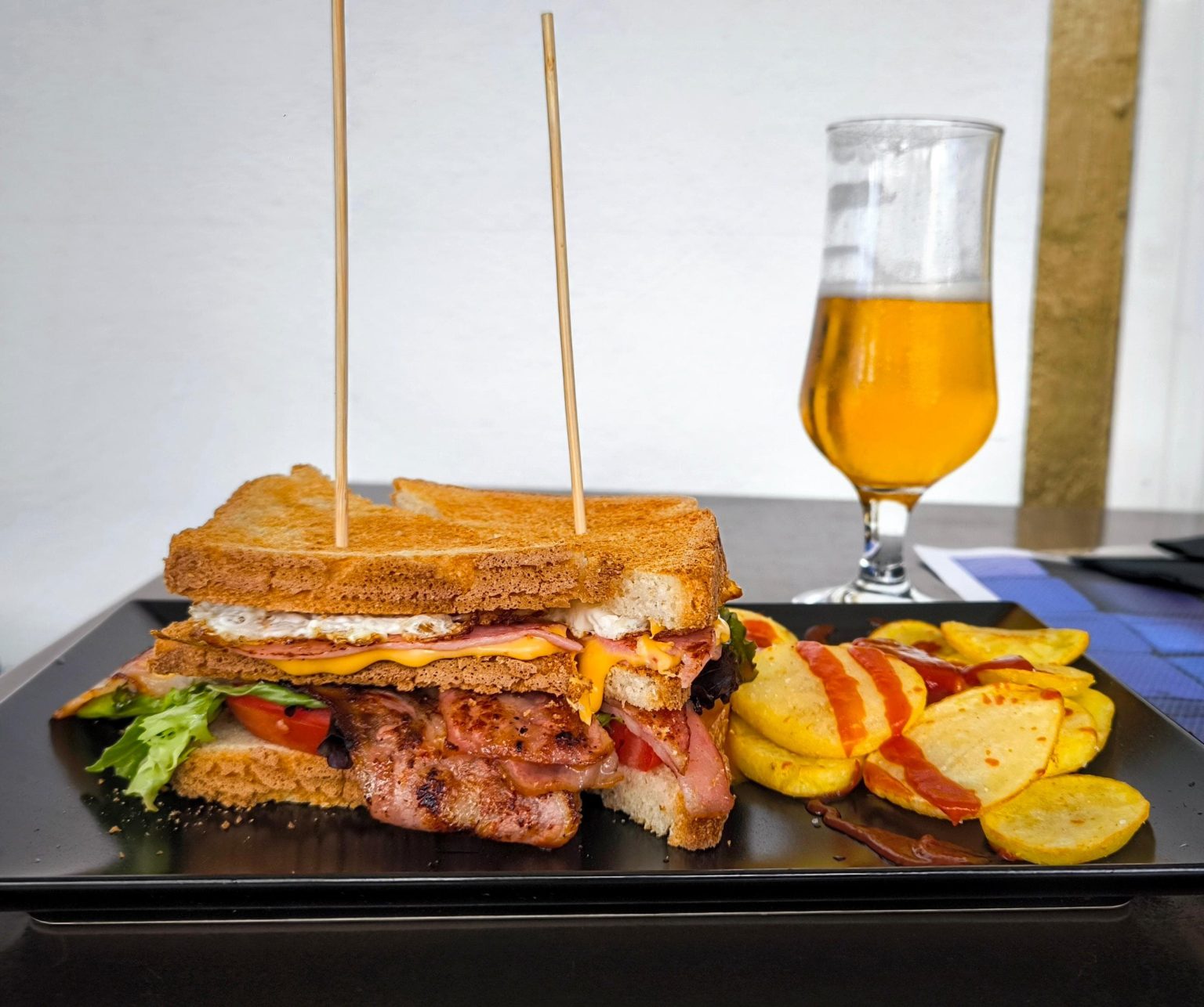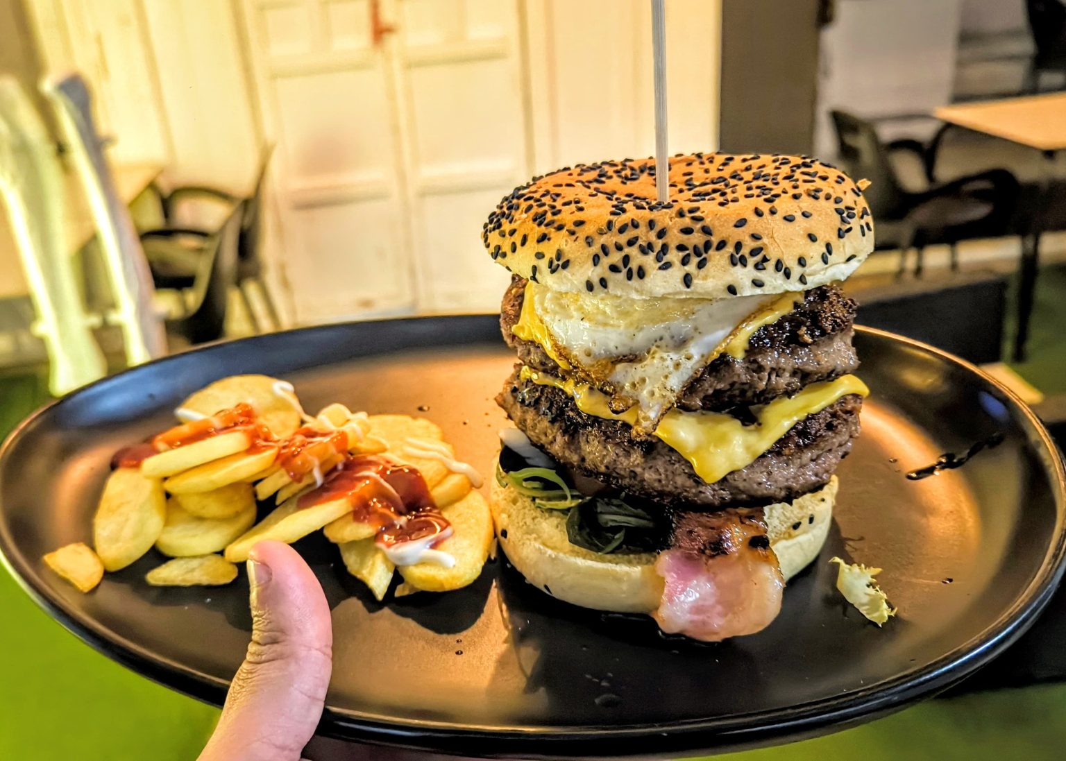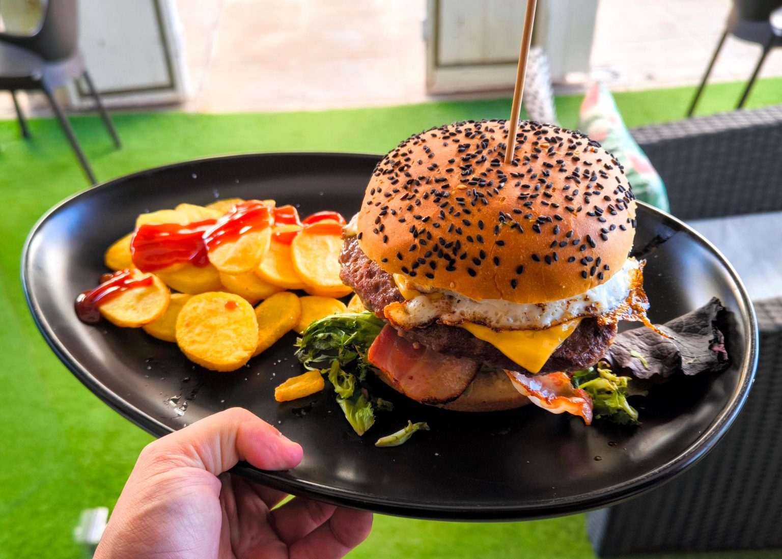 Carne 80% buey 20% ternera, tomate, lechuga bacon, cheddar, huevo, cebolla caramelizada y patatas fritas