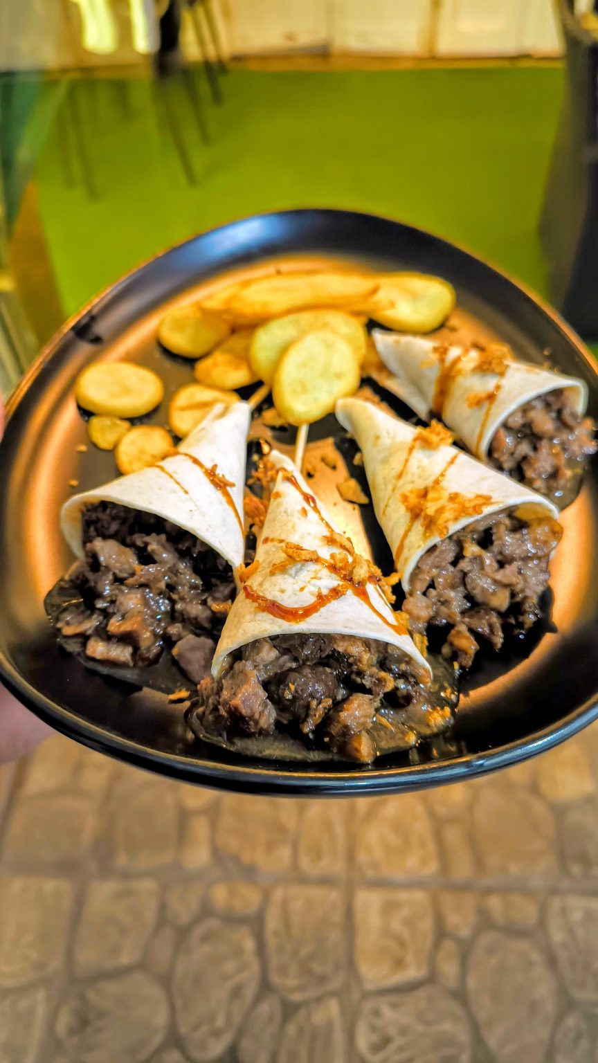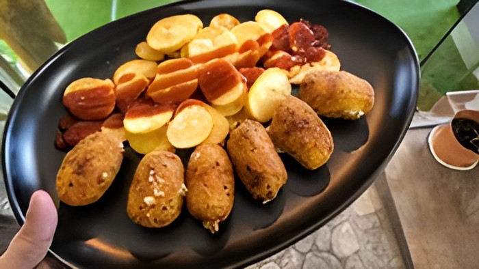 Confitadas con salsa barbacoa y miel de caña, fideos chinos y patatas fritas