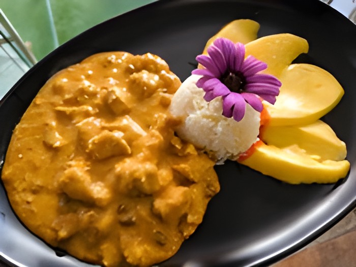 Con salsa cremosa de curry Buddha hecho con nueces y pasas, acompañado de arroz o quinoa y mango