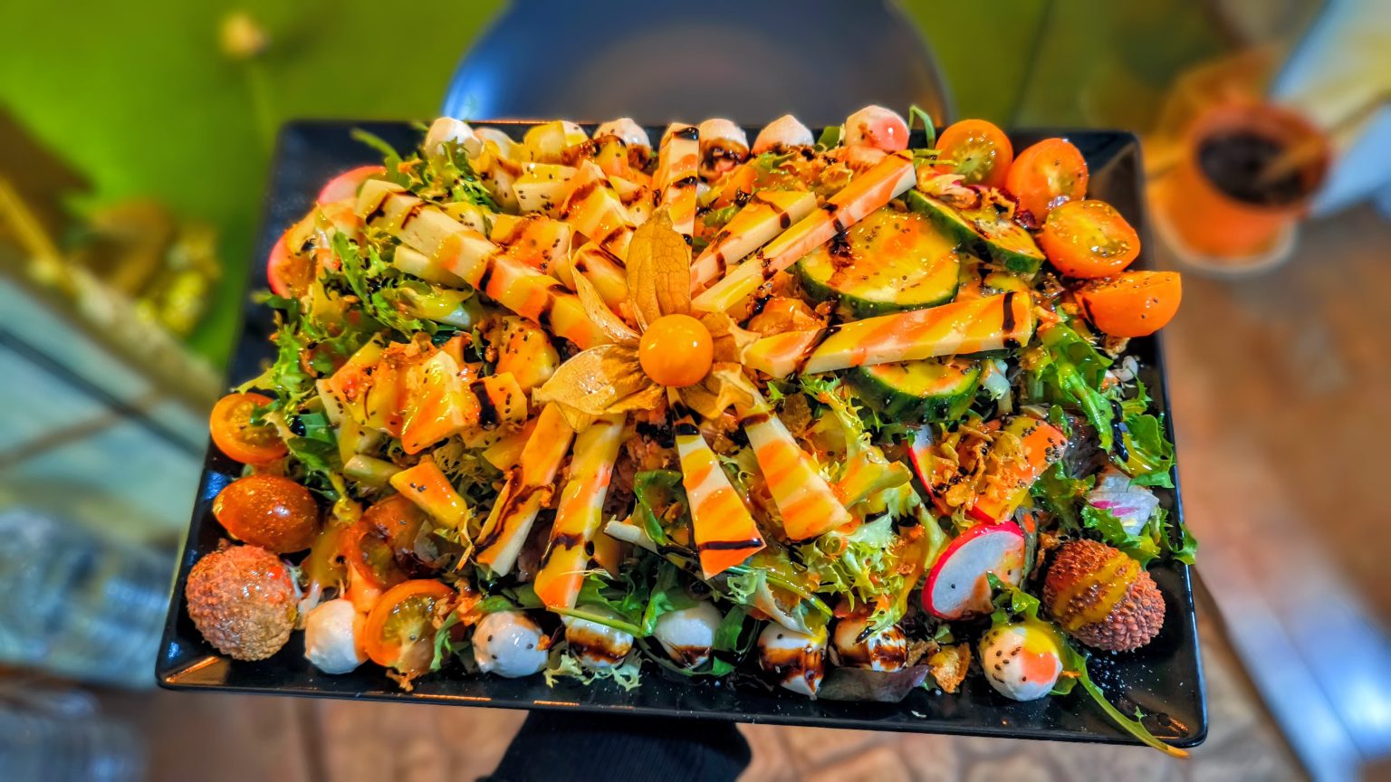 Mezcla de lechugas con nueces y frutos secos, con mozzarella de búfala, aove y vinagre de módena