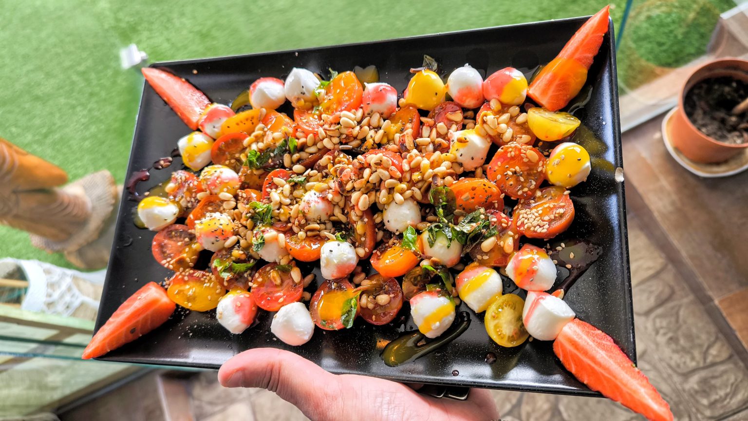 Con perlas de mozzarella, piñones y albahaca, con aove y vinagreta de frutos rojos